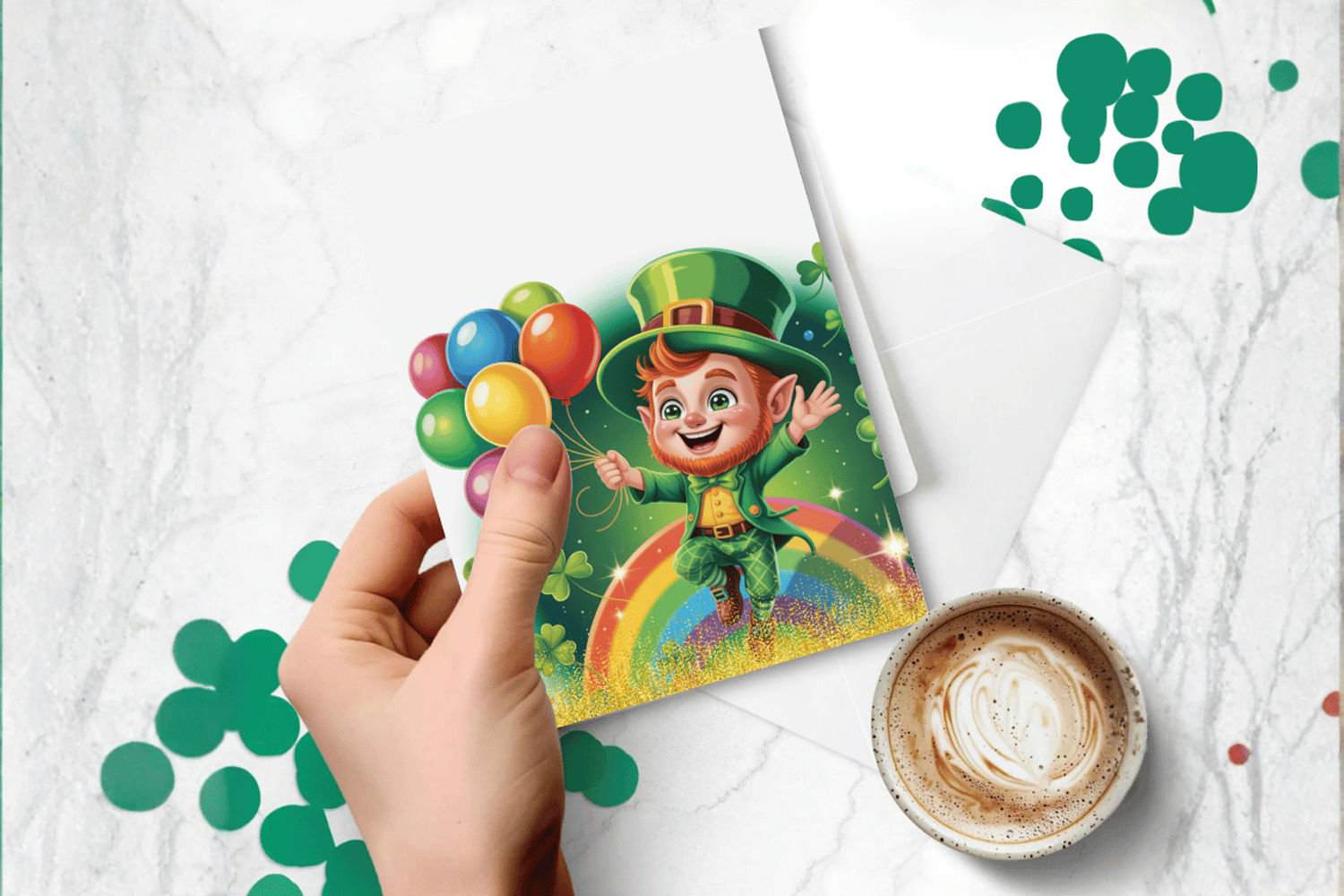 Similar Design Products to Cute Leprechaun with Rainbow and Balloons Greeting Card PNG