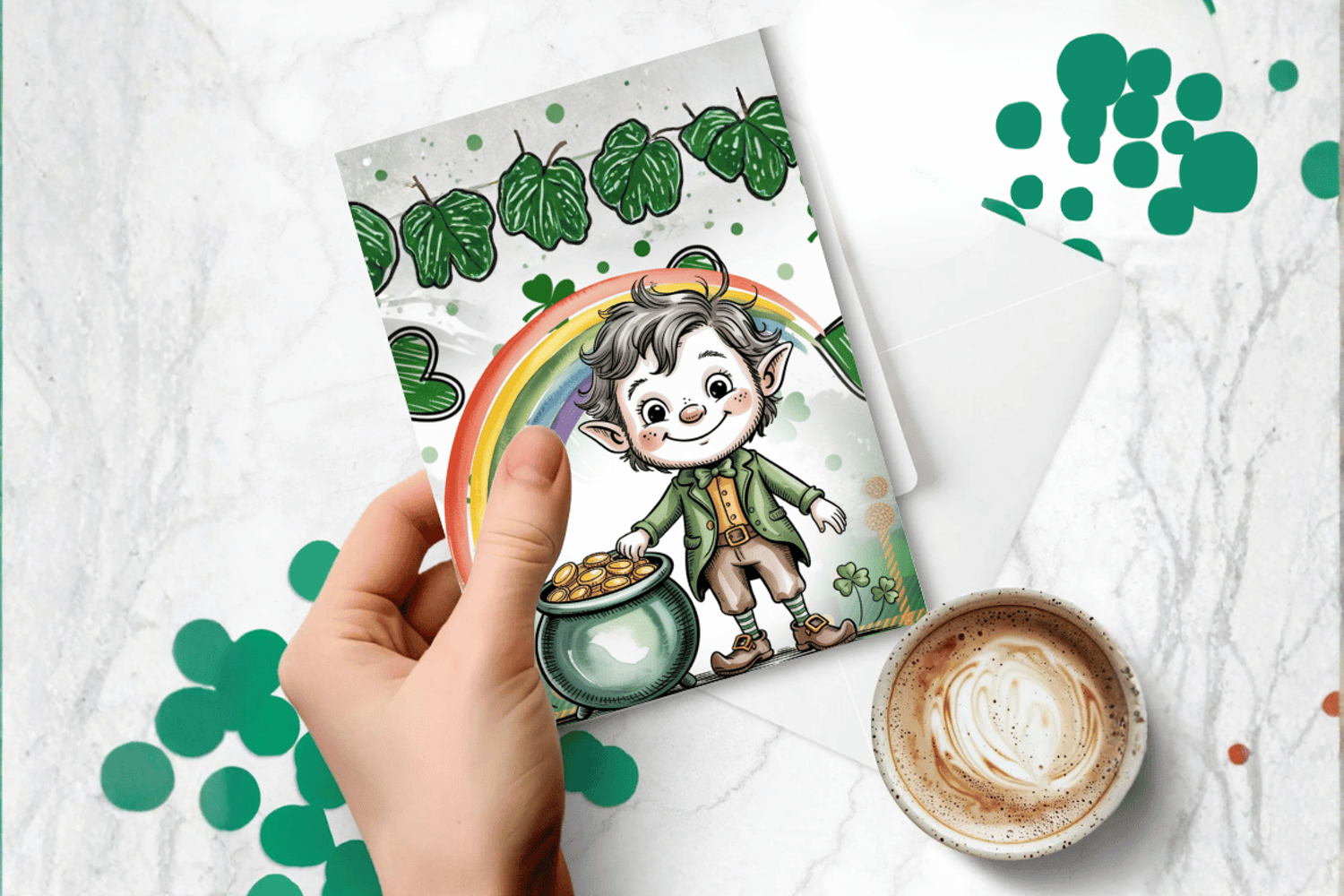 Cute Leprechaun with Rainbow and Gold Pot Greeting Card PNG example image 1