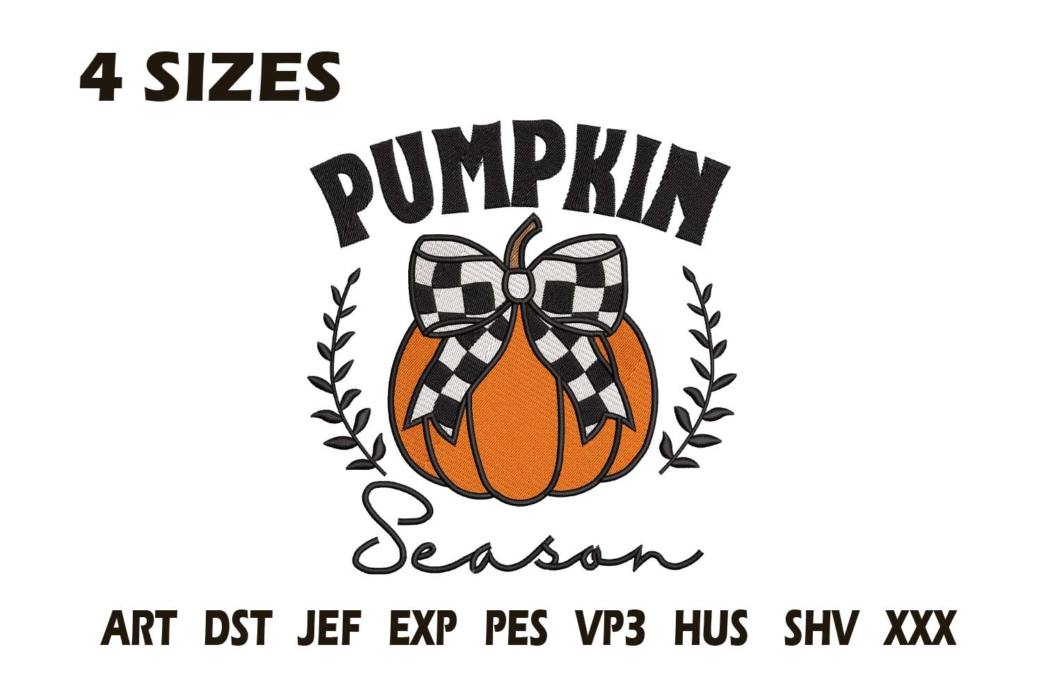 Featuring a classic orange pumpkin topped with a stylish black-and-white checkered bow and framed by laurel leaves, this design captures the heart of fall farmhouse style. Perfect for sweatshirts, tote bags, kitchen towels, or home decor, it brings warmth and charm to every stitch.