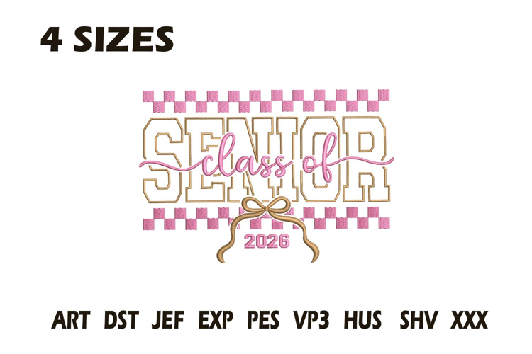 This Senior Class of 2026 Embroidery Design features bold varsity lettering with elegant pink script and a cute ribbon accent — perfect for celebrating your senior year in style! Ideal for graduation gifts, senior apparel, or school spirit projects.