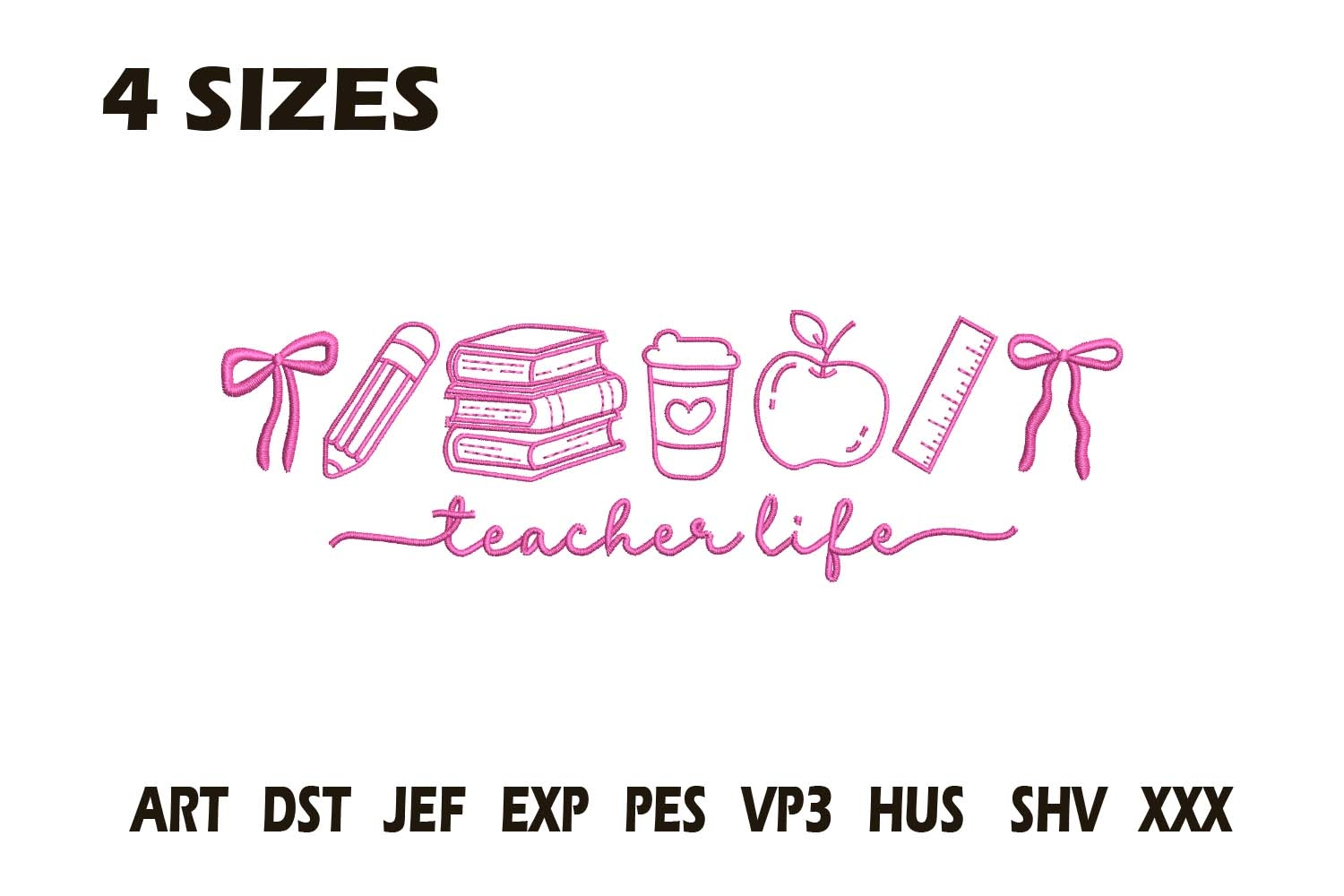 This Teacher Life Embroidery Design features adorable school icons — books, pencils, coffee cups, apples, rulers, and bows — with elegant “teacher life” script. Perfect for teachers who love stylish and meaningful embroidery projects!