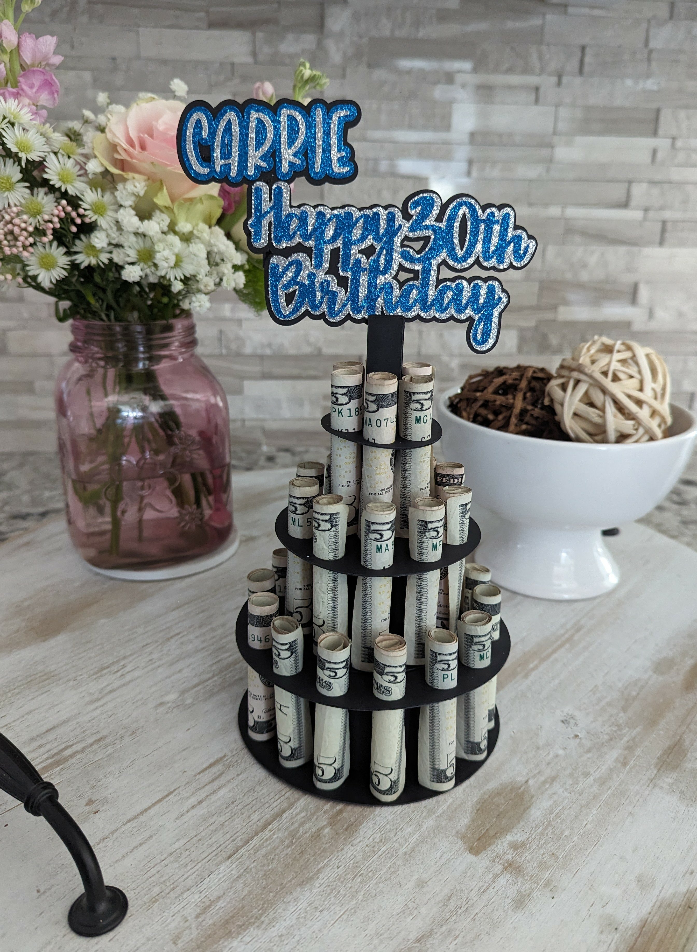 I love the uniqueness of these money cakes and thought this would be perfect for my daughter's 30th birthday. The file was compatible with Cricut Design Space and I cut it out with my Maker 3. The file comes with link to a YouTube video for assembly instructions. It cut nicely and was simple to put together. To personalize the gift, I designed a cutout of my daughter's name. The personalization is not part of the file.