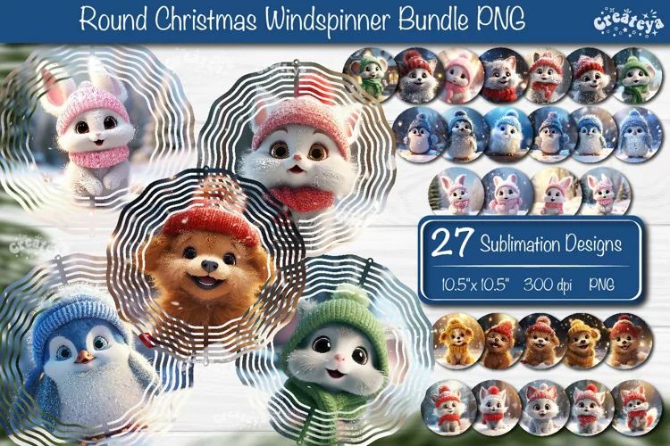 Round Christmas Wind Spinner Bundle with Cute Pinguin, Cat, Puppies, and Christmas Animals PNG. Bundle contains 27 designs PNG These Christmas designs of wind spinner bring a touch of snow-filled charm and a warm, fuzzy feeling to your home decor.