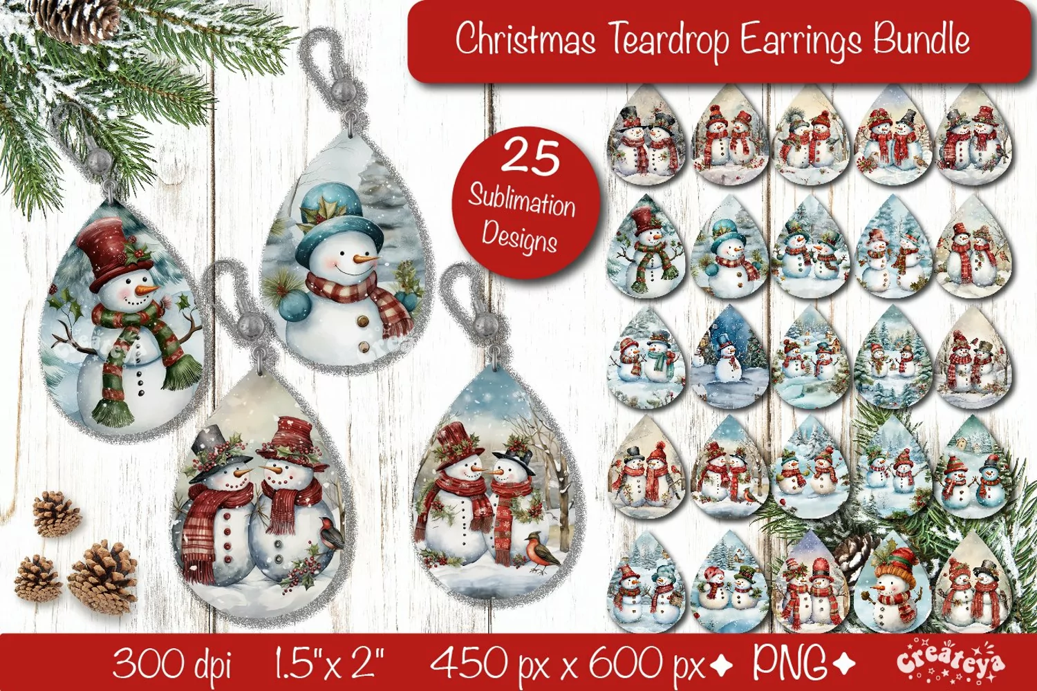 Christmas teardrop earrings Bundle sublimation design with watercolor Snowman. This Christmas teardrop earrings sublimation product contains 25 designs with a Christmas watercolor snowman