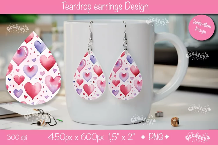 Valentine teardrop earrings sublimation design with watercolor Flower earrings with hearts. Express your individuality, elevate your mood, and spread joy with these earrings. They also make a perfect gift for any occasion. Embrace your unique style!