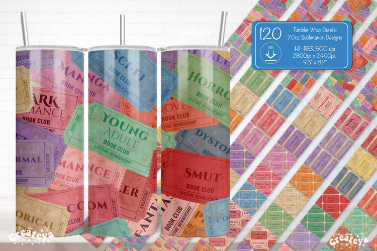 This Book Club Ticket Tumbler Wrap Bundle includes 120 high-quality PNG designs featuring colorful vintage-style library tickets themed by reading genres — Fantasy, Romance, Mystery, Sci-Fi, Poetry, Dark Romance, Smut, and more.