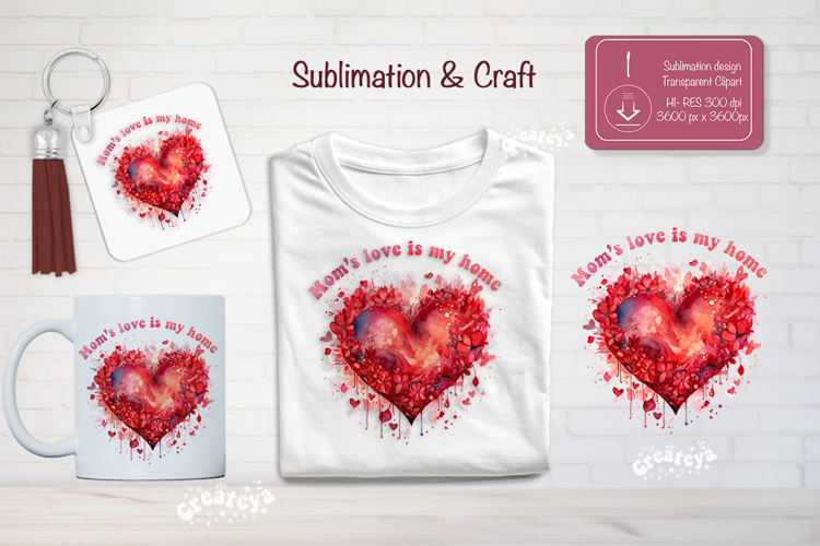 A beautiful Mother’s Day sublimation design with watercolor floral hearts. Perfect for creating gifts for mom such as t-shirts, mugs, tote bags, keychains, earrings, and more.