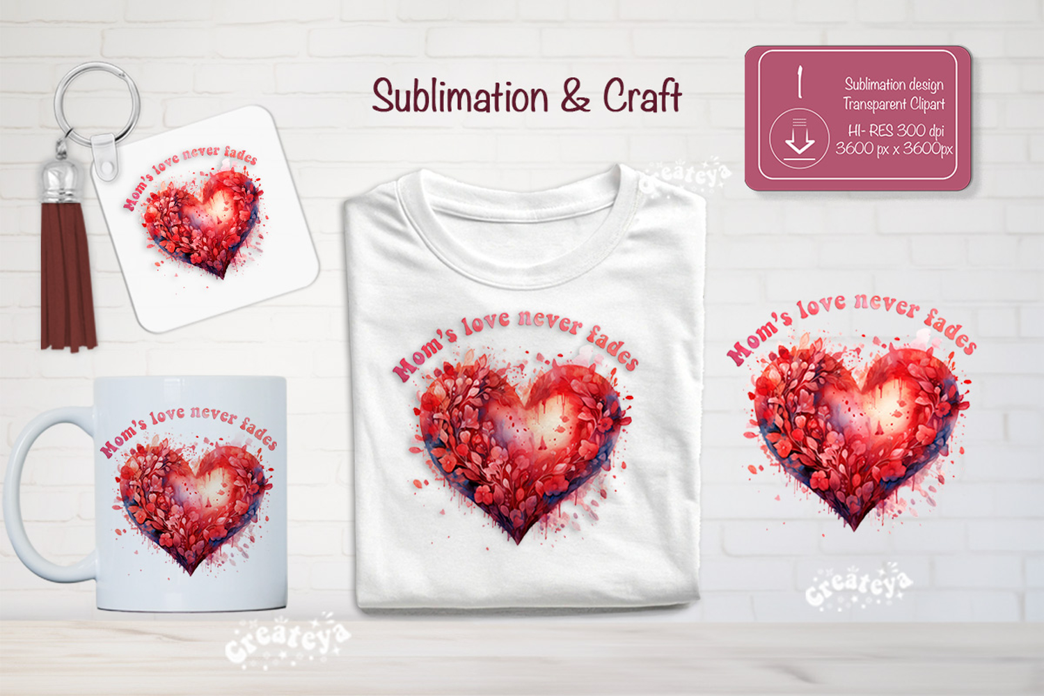 A beautiful Mother’s Day sublimation design with watercolor floral hearts. Perfect for creating gifts for mom such as t-shirts, mugs, tote bags, keychains, earrings, and more.