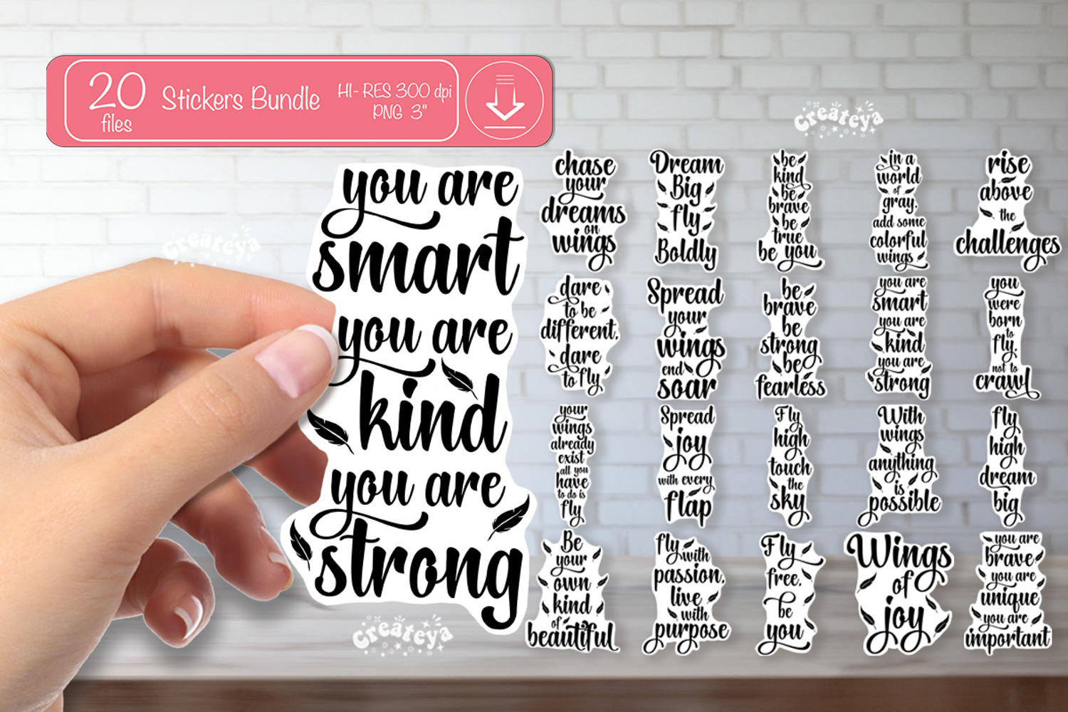 This bundle includes 20 motivational quote designs in a clean black lettering style — perfect for creating stickers, gifts, and personalized products with a positive message.
