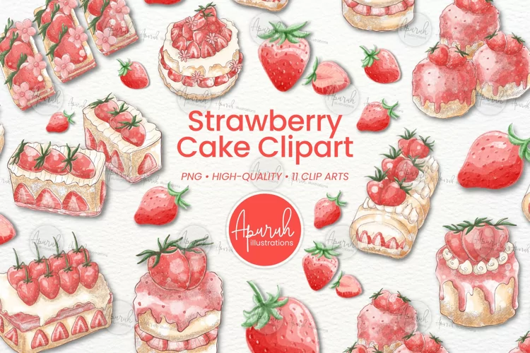 ▶ Strawberry Cake Watercolor Clipart inclusions: