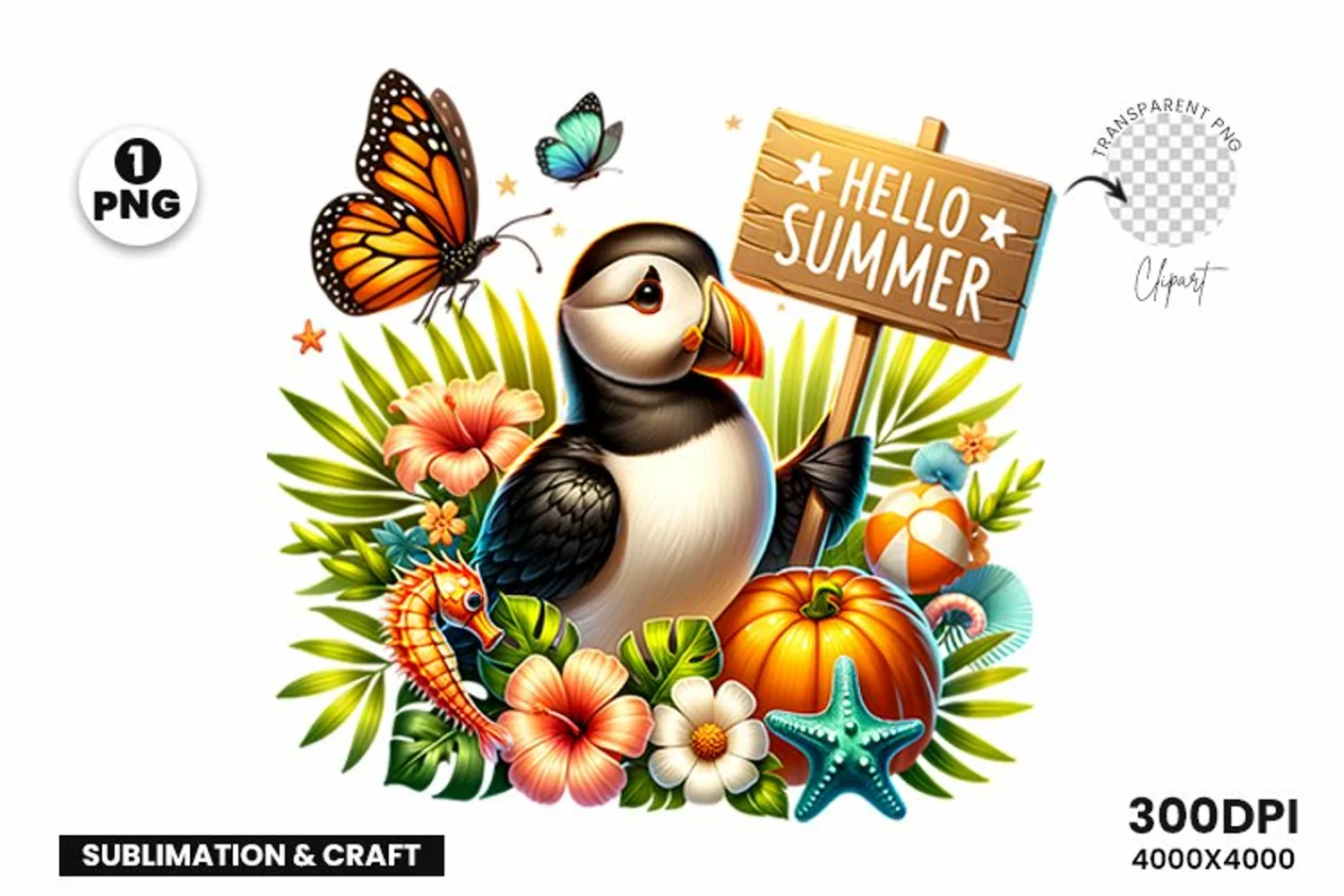 "Embrace the enchantment of Hello Summer with our charming Summer Sublimation Atlantic Puffin | Sublimation Clipart PNG. Crafted to perfection, this collection of 1 high-resolution PNG Files, each with a transparent background, offers exceptional quality at 300 dpi with a generous 4000x4000 pixel resolution.