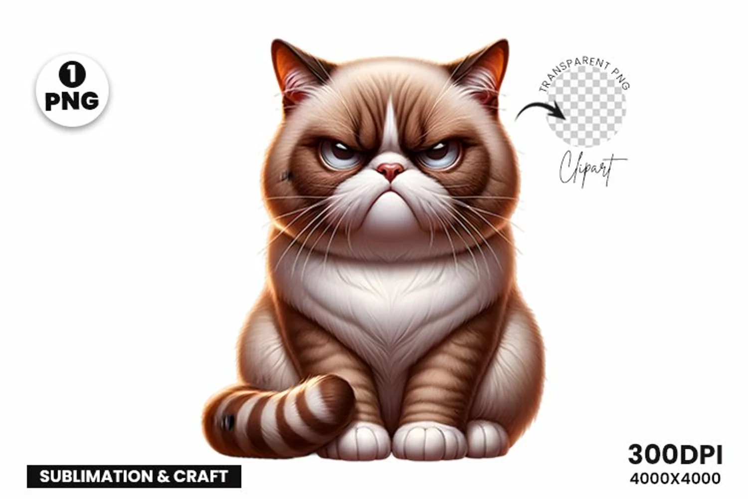 "Embrace the enchantment of Grumpy with our charming Funny Grumpy Cat Clipart PNG | Sublimation Clipart Design. Crafted to perfection, this collection of 1 high-resolution PNG File, each with a transparent background, offers exceptional quality at 300 dpi with a generous 4000x4000 pixel resolution.