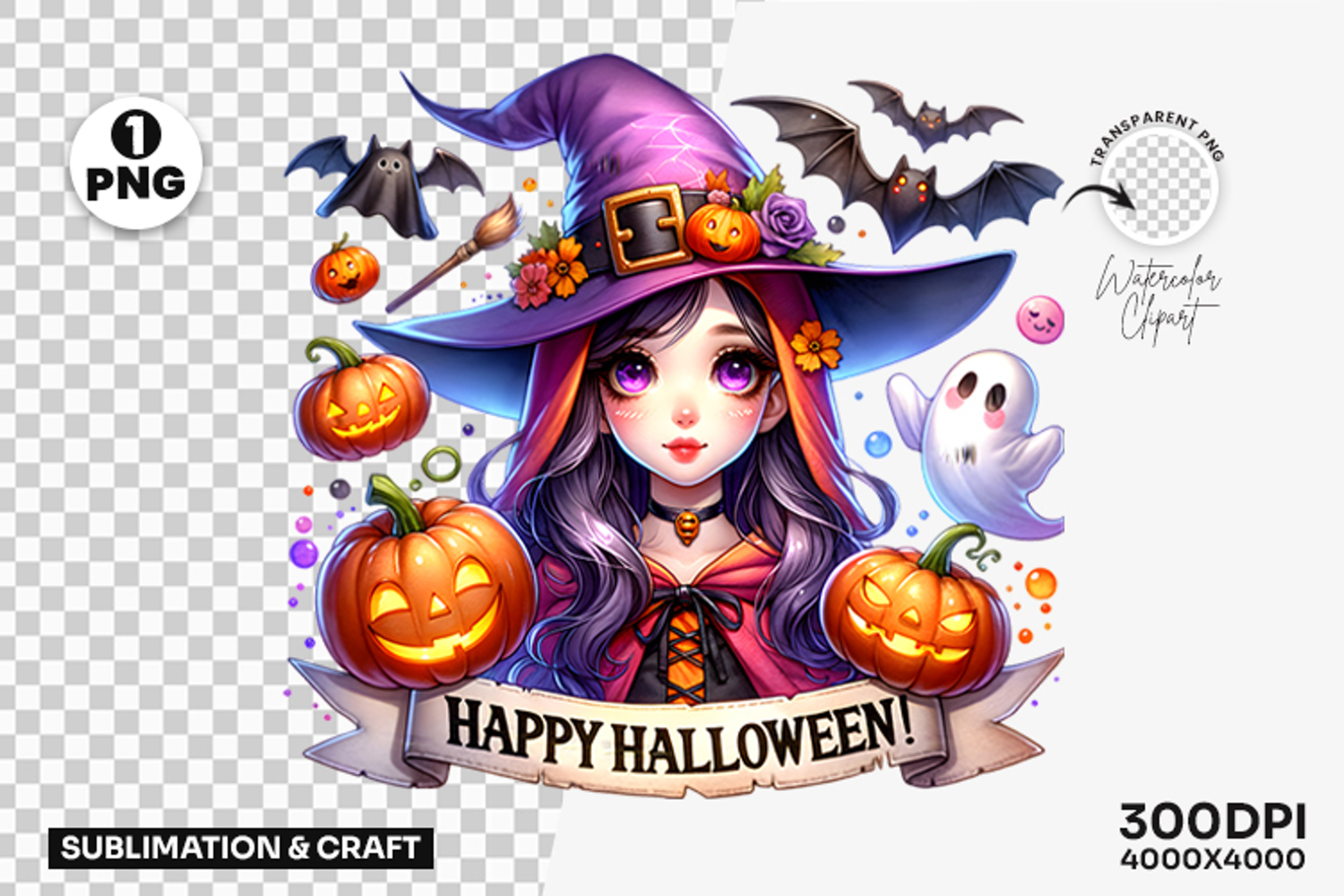 Crafted in high resolution (300 DPI) with a transparent background and large 4000x4000 pixel size, this clipart is ideal for sublimation projects, apparel designs, party invitations, stickers, mugs, and more. Add a festive and magical vibe to your Halloween crafts!