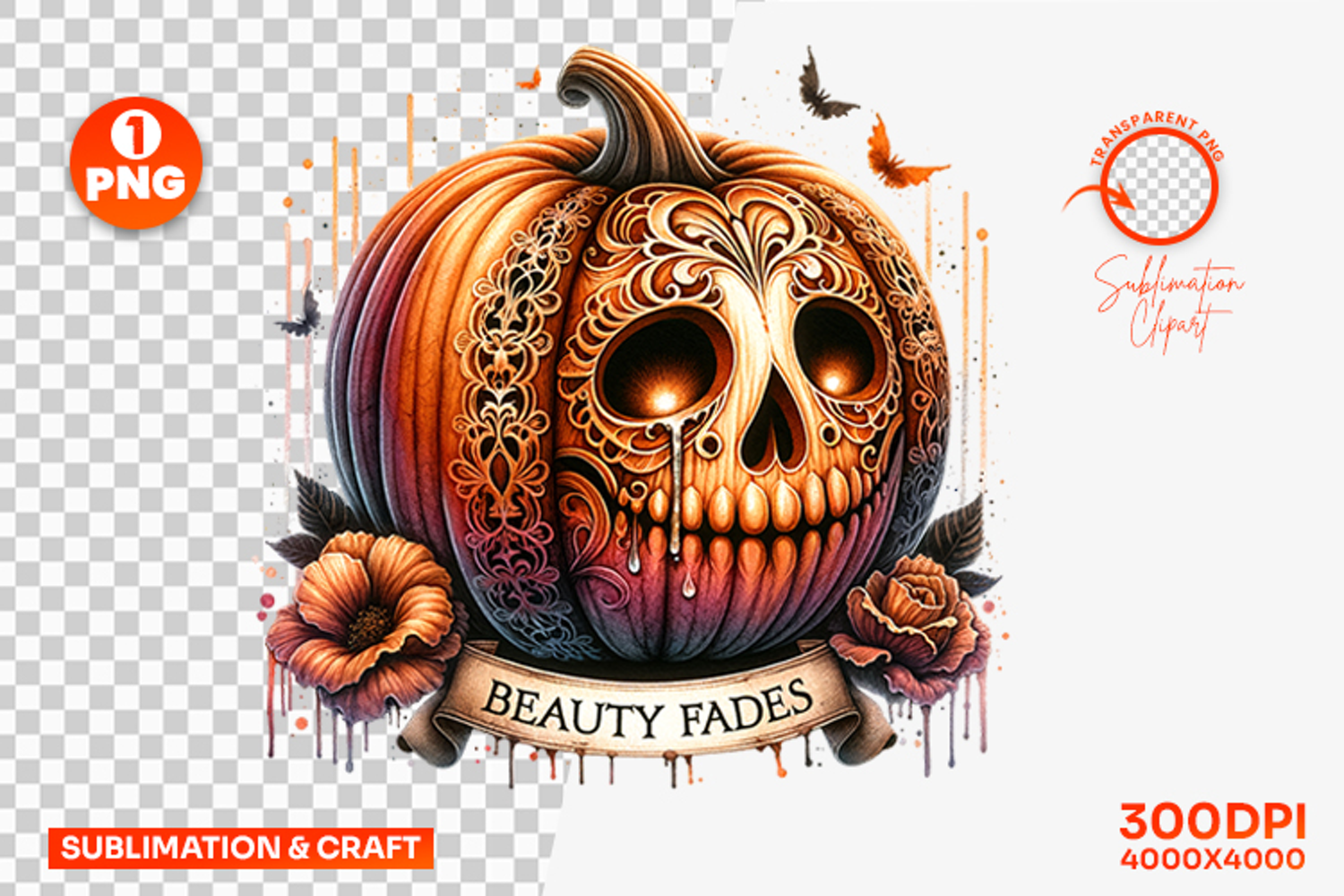 💀🎃 Add a chilling twist to your spooky projects with our Beauty Fades Skull Pumpkin Clipart PNG Sublimation Design! Featuring a creepy pumpkin with haunting skull details, this
