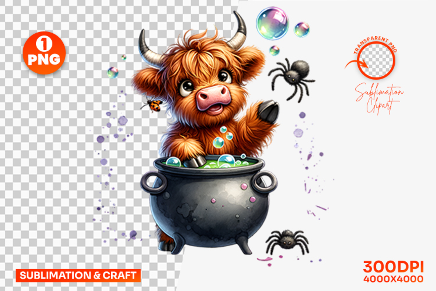 Halloween Cow Cauldron Spider Clipart PNG Sublimation Design