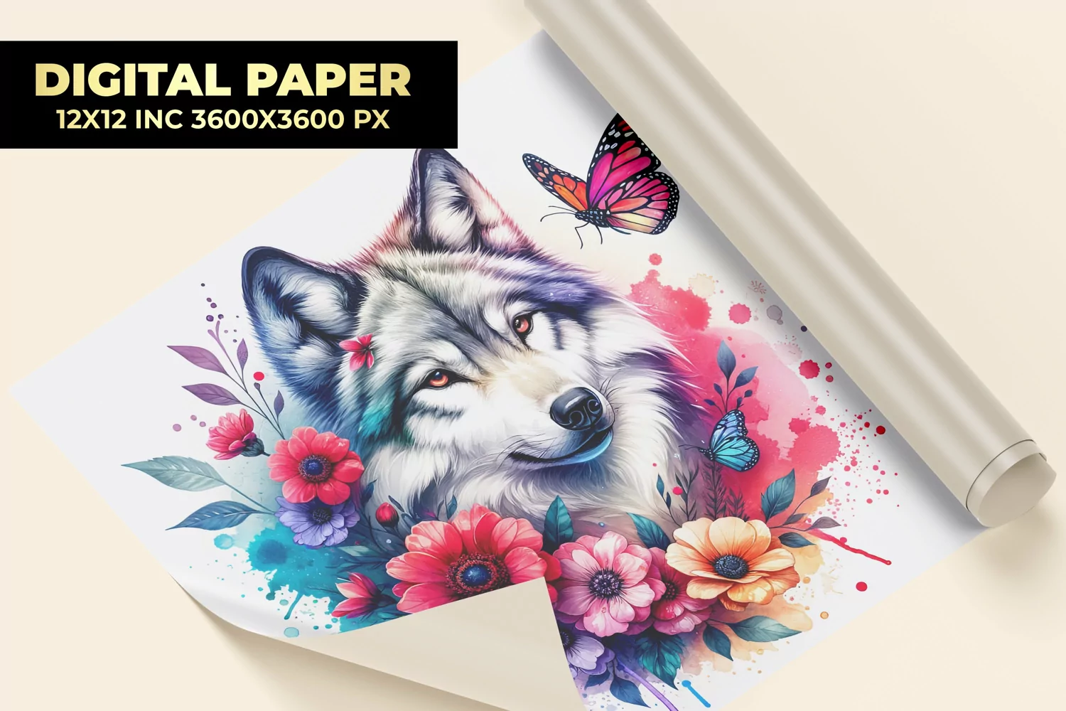 Wolf With Floral Watercolor Digital Paper