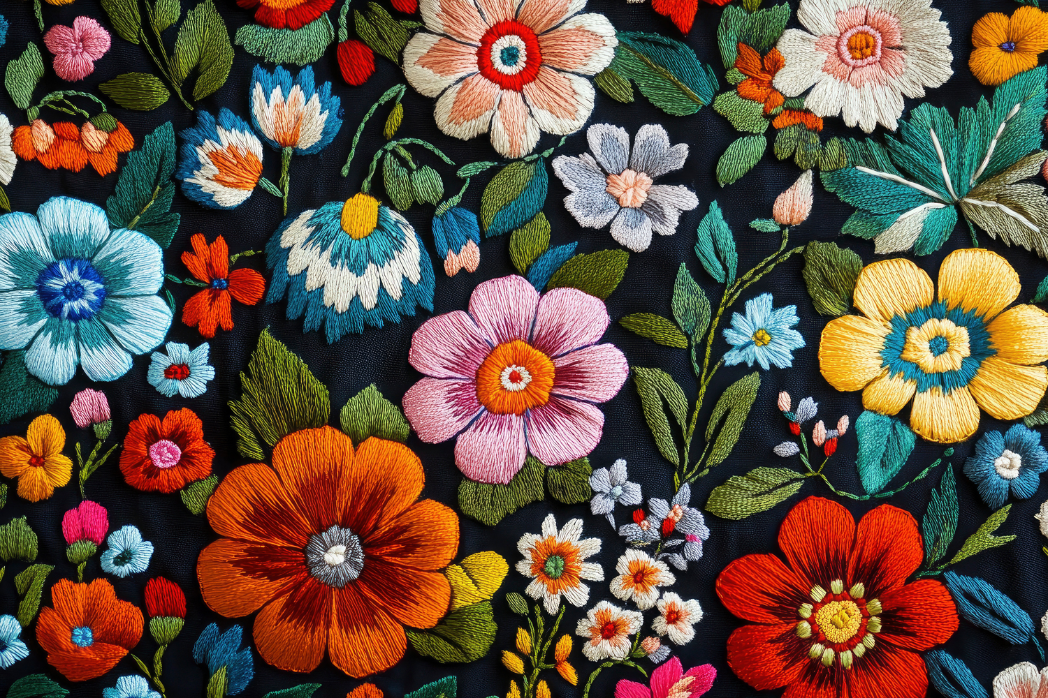 Colorful Embroidery on Black Fabric Background Wallpaper