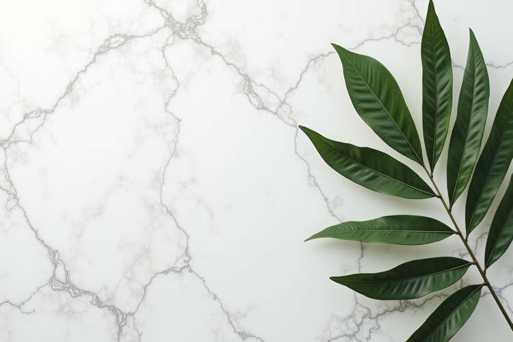 White Marble Backdrop Adorned with Green Leaves Background