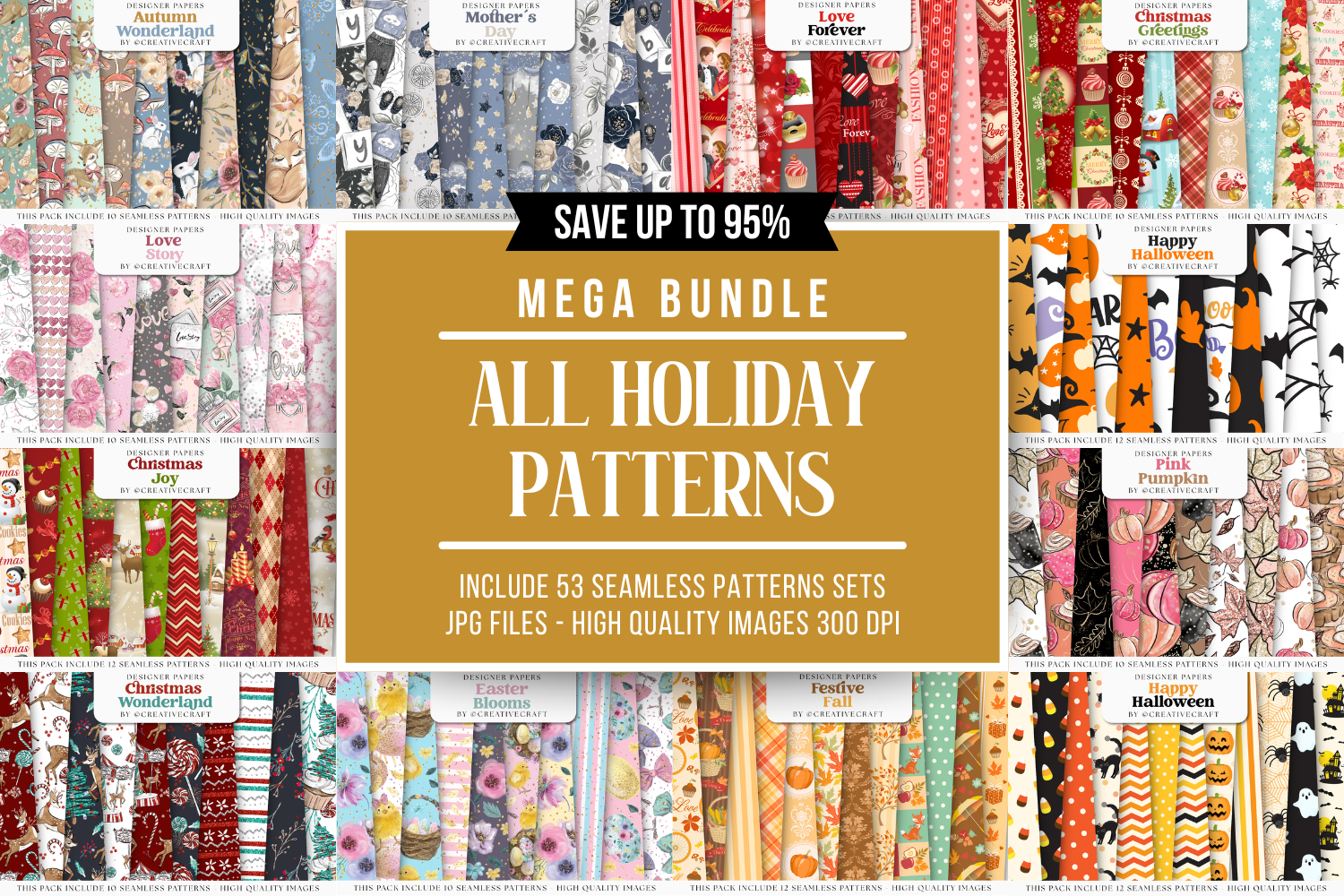 This cute Mega Bundle Seamless Patterns set is perfect for all your crafts and projects.