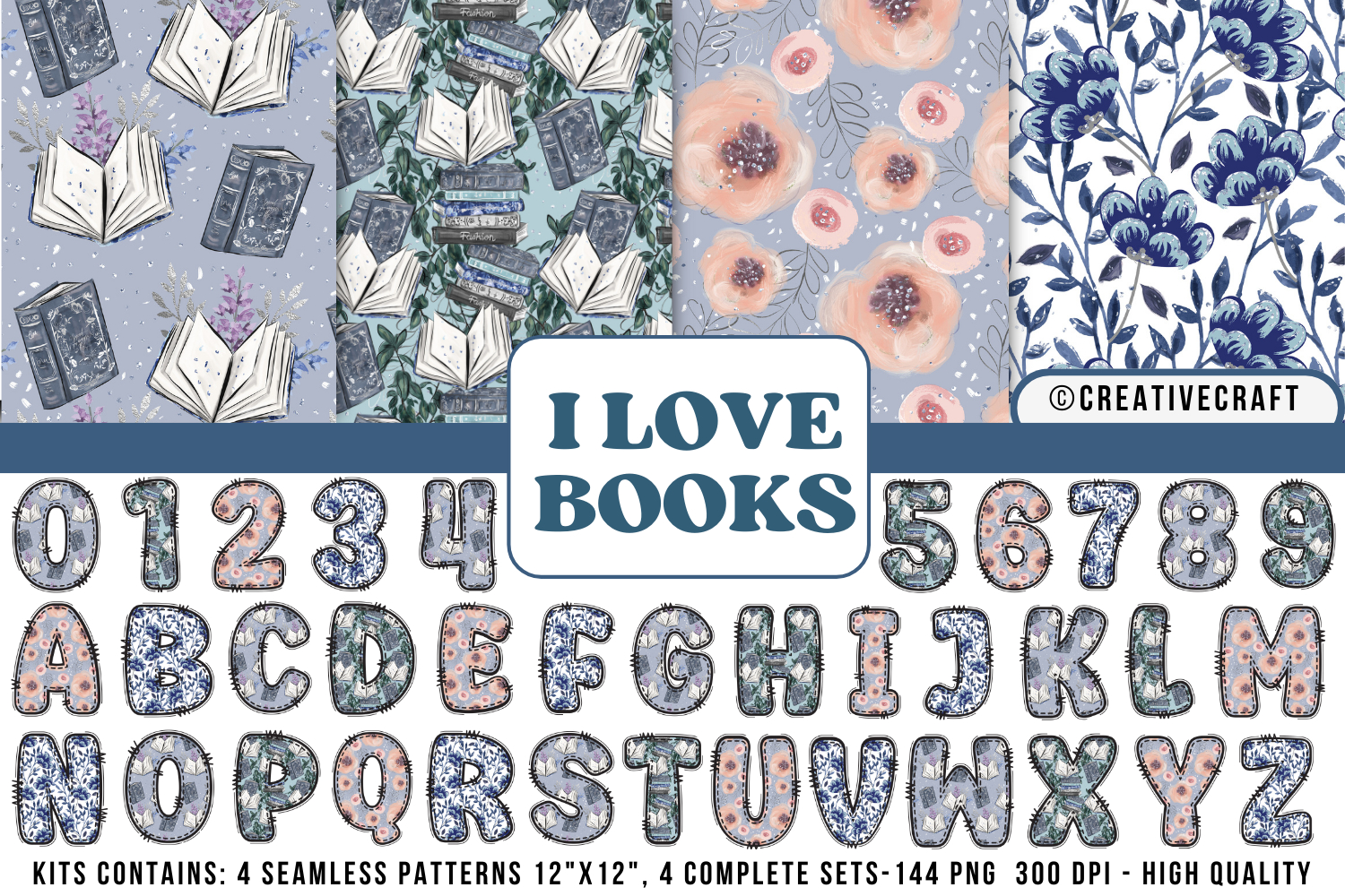 I Love Books Seamless Patterns, Book Lover doodle letters example image 1