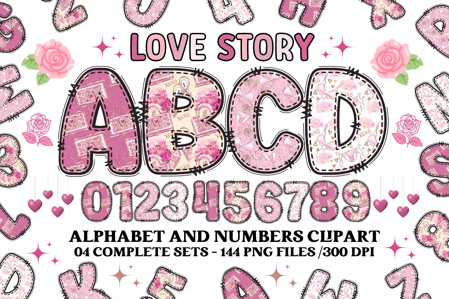This collection features beautiful stitched-style letters and numbers, decorated with soft pink tones, floral details and love-themed patterns — perfect for both seasonal and year-round designs.