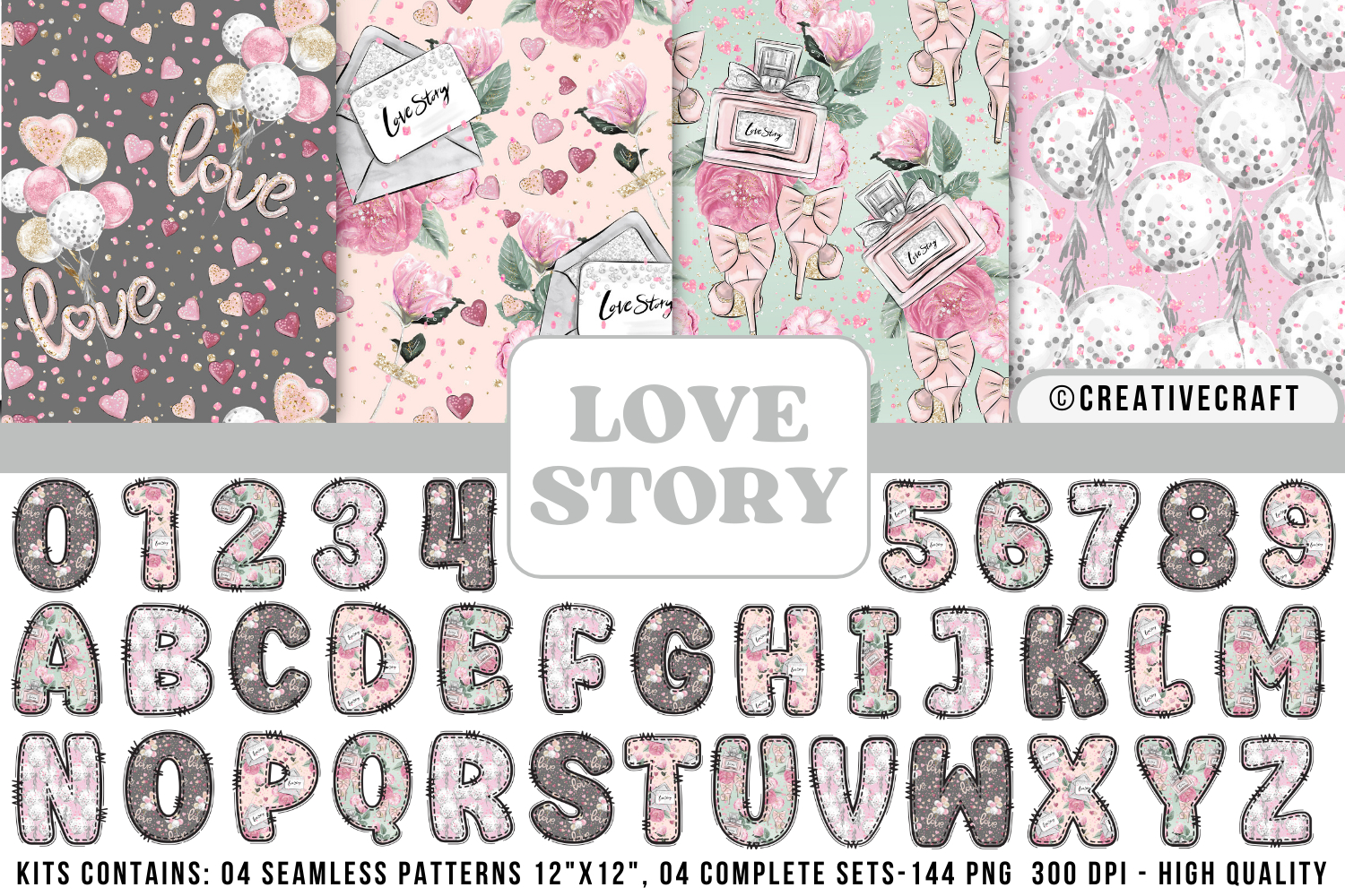 This beautifully designed digital kit features textured floral letters, numbers, and seamless patterns in a soft shabby chic style. It is perfect for a wide variety of creative projects, including romantic stationery, event designs, scrapbooking, fabric prints, sublimation designs, and decorative graphics.
