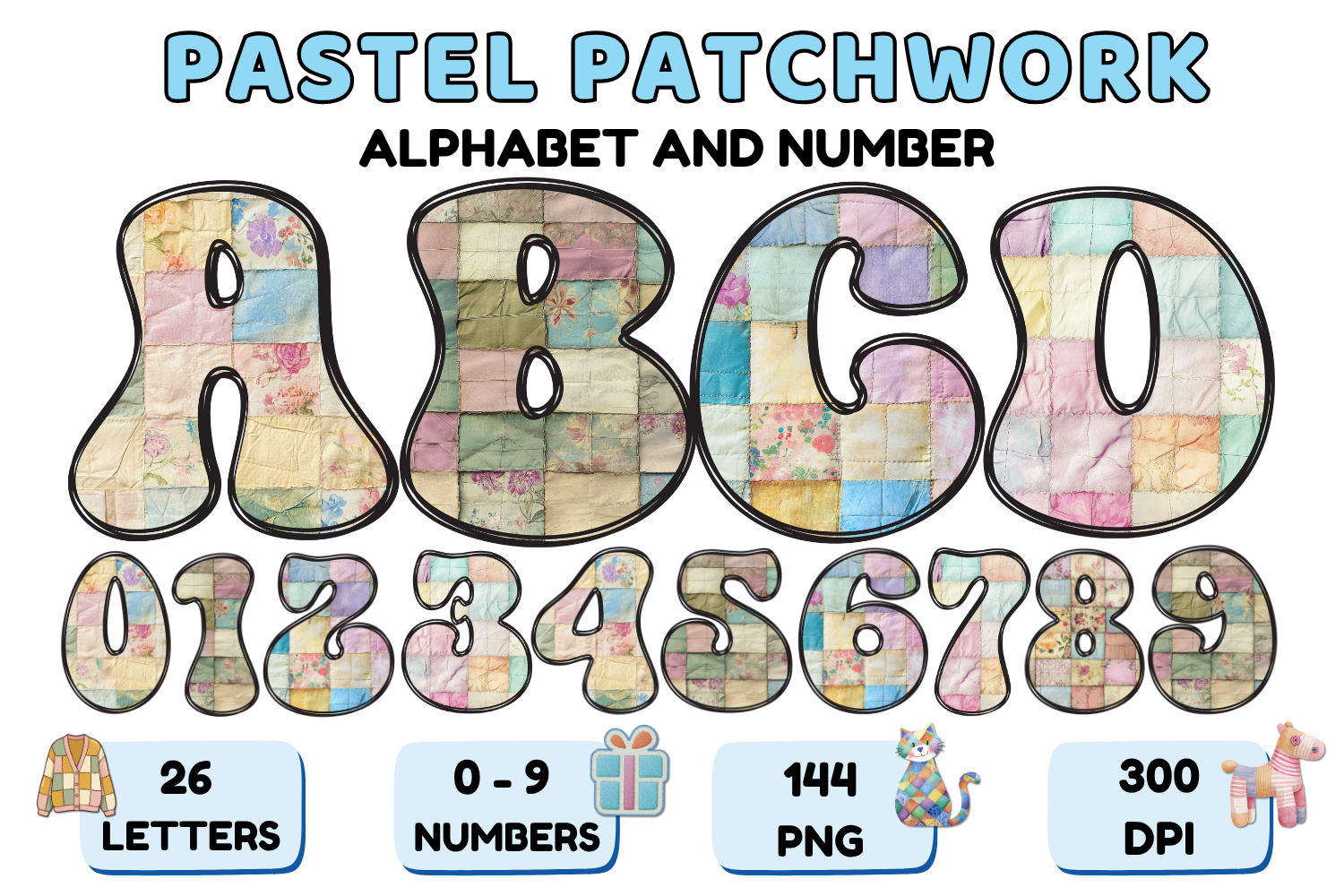 Pastel Patchwork Alphabet Numbers PNG Doodle Letters Clipart example image 1