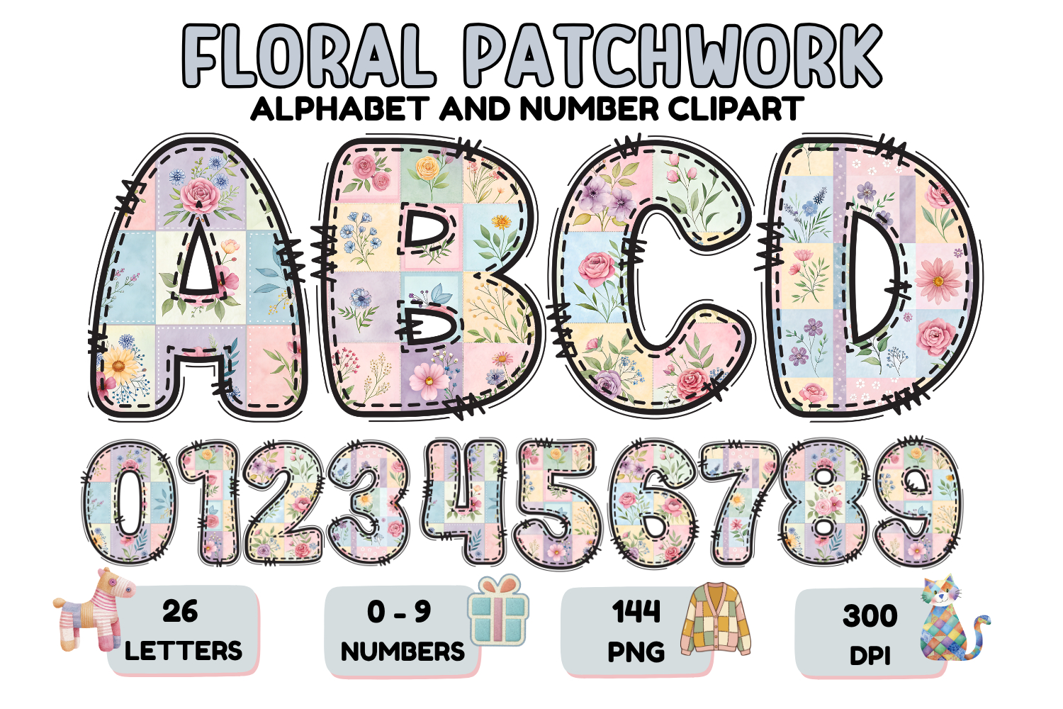 Floral Patchwork Alphabet & Numbers Clipart 144 PNG 300 DPI