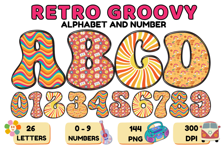 Retro Groovy Alphabert PNG 70s Numbers & Letters 300 DPI example image 1