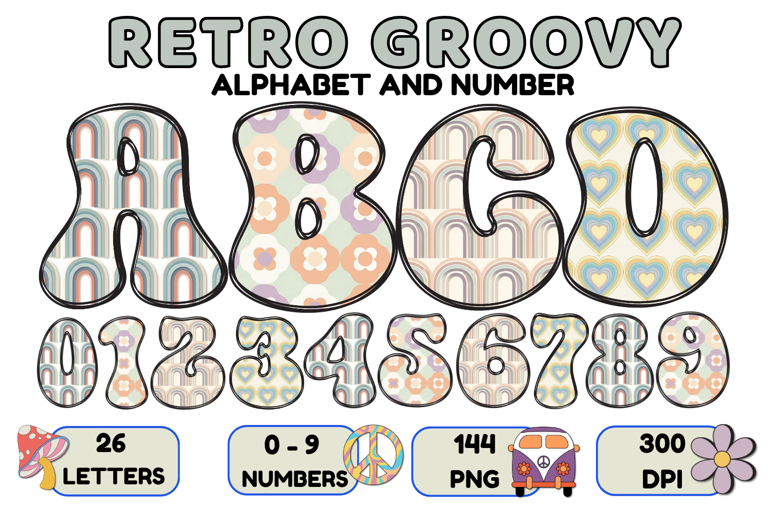 Retro Groovy Alphabert PNG 70s Numbers & Letters 300 DPI