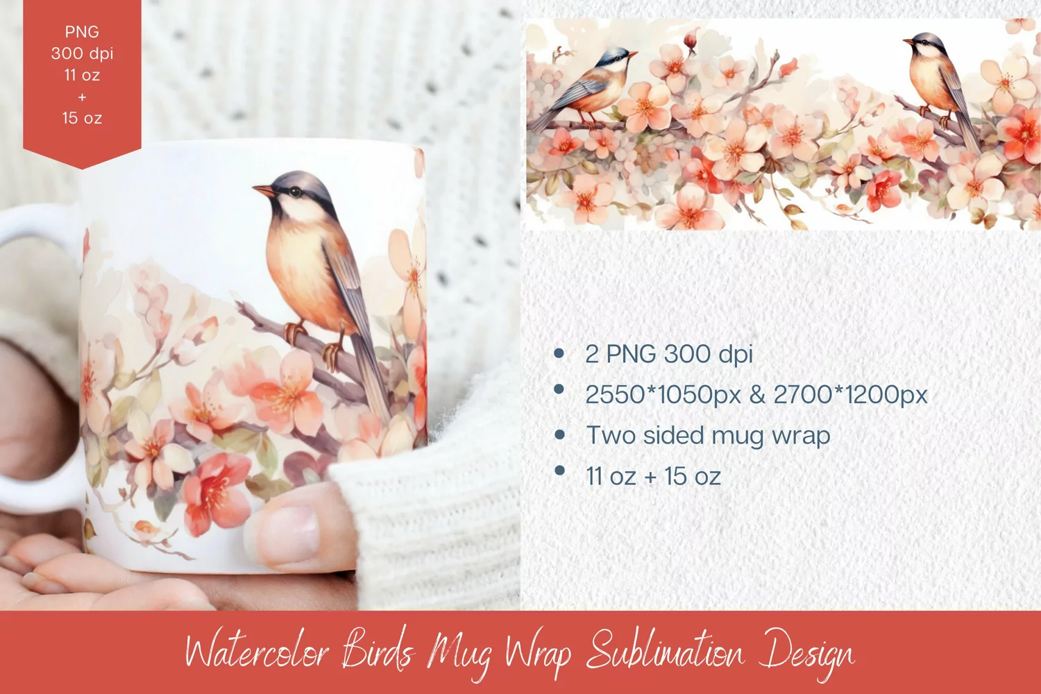 Watercolor Floral Birds Mug Wrap Sublimation Design