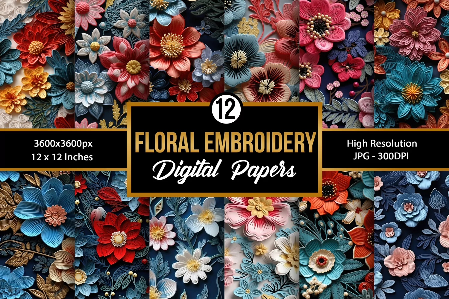 12 Embroidery Flowers Seamless Pattern Digital Paper Backgrounds