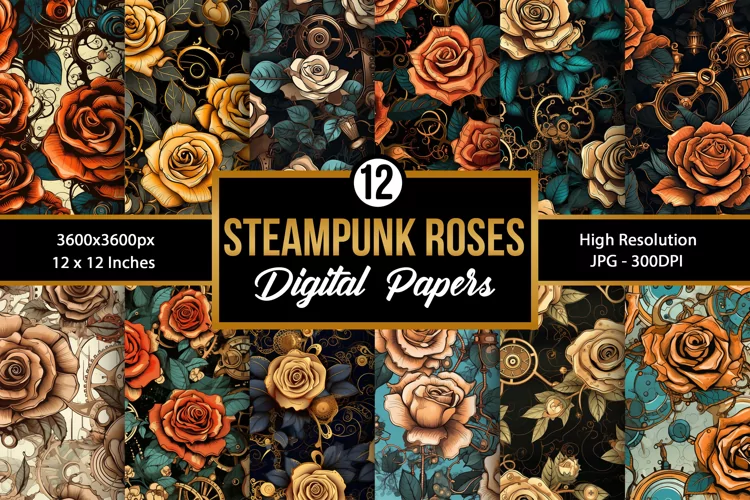12 Steampunk Roses Seamless Pattern Digital Papers