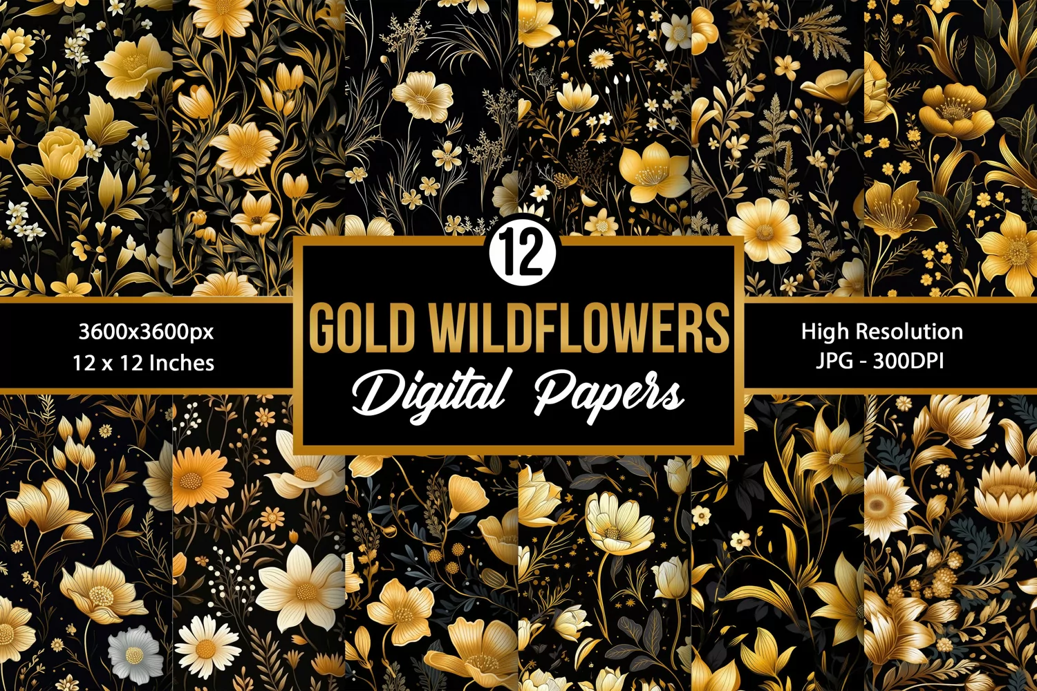 12 Gold Wildflowers Seamless Pattern Digital Papers