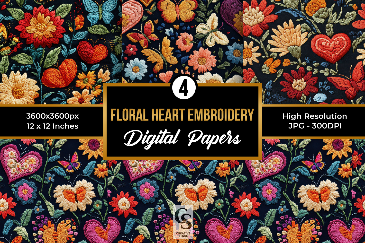 Floral Heart Embroidery Digital Paper Pattern example image 1