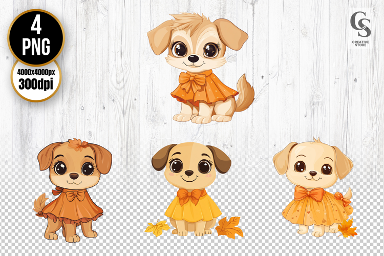 4 Cute Autumn Baby Puppy Clipart Sublimation PNG Files Perfect for Greeting Cards, Invitations, Junk Journal, Party Decor, Scrapbooking and many other craft projects.