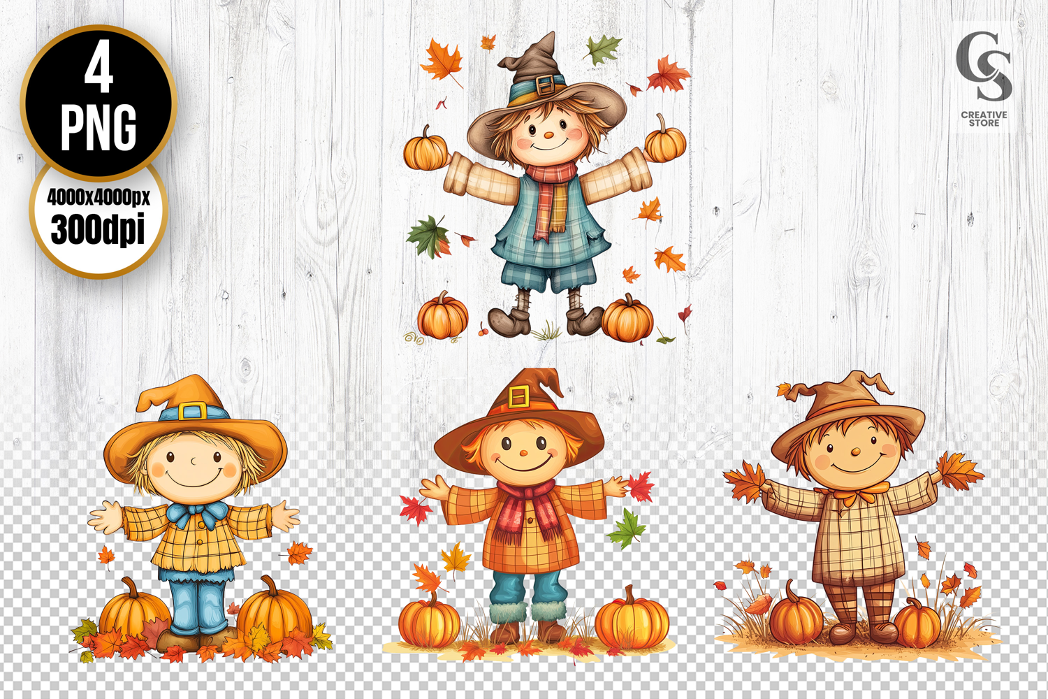 4 Cute Autumn Scarecrow Clipart Sublimation PNG Files Perfect for Greeting Cards, Invitations, Junk Journal, Party Decor, Scrapbooking and many other craft projects.