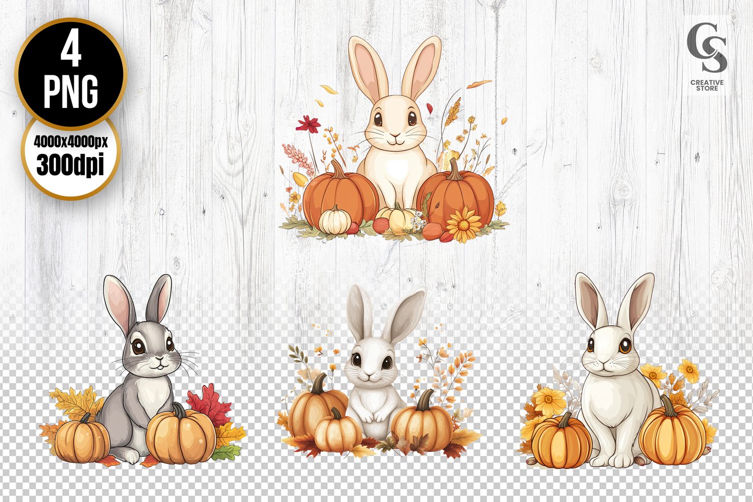 4 Autumn Bunny with Pumpkins Clipart PNG Files Perfect for Greeting Cards, Invitations, Junk Journal, Party Decor, Scrapbooking and many other craft projects.