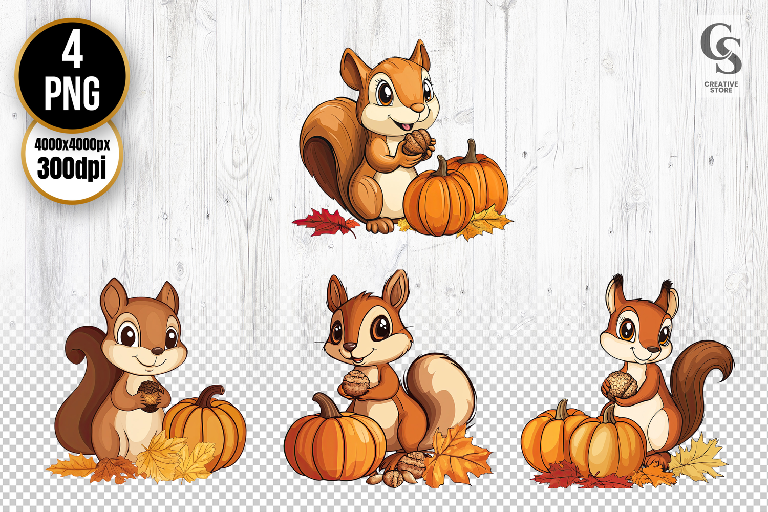 4 Autumn Squirrel with Pumpkins Clipart PNG Files Perfect for Greeting Cards, Invitations, Junk Journal, Party Decor, Scrapbooking and many other craft projects.