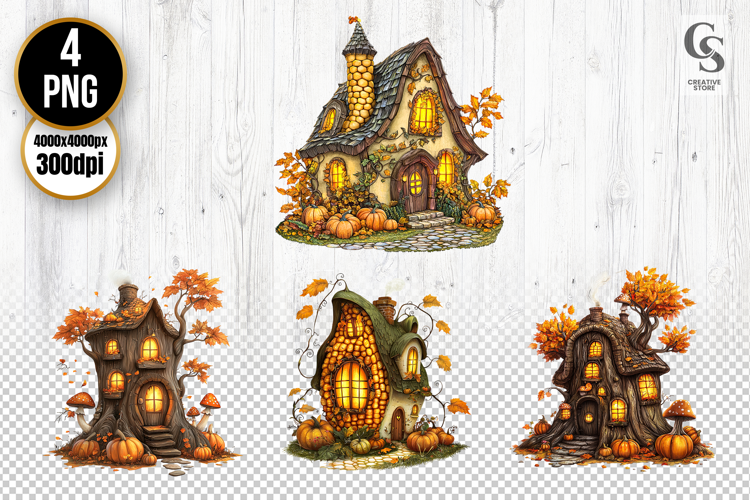 4 Fantasy Autumn Pumpkin Cottage House Clipart PNG Files Perfect for Greeting Cards, Invitations, Junk Journal, Party Decor, Scrapbooking and many other craft projects.