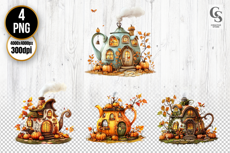 4 Fantasy Autumn Teapot Cottage House Clipart PNG Files Perfect for Greeting Cards, Invitations, Junk Journal, Party Decor, Scrapbooking and many other craft projects.