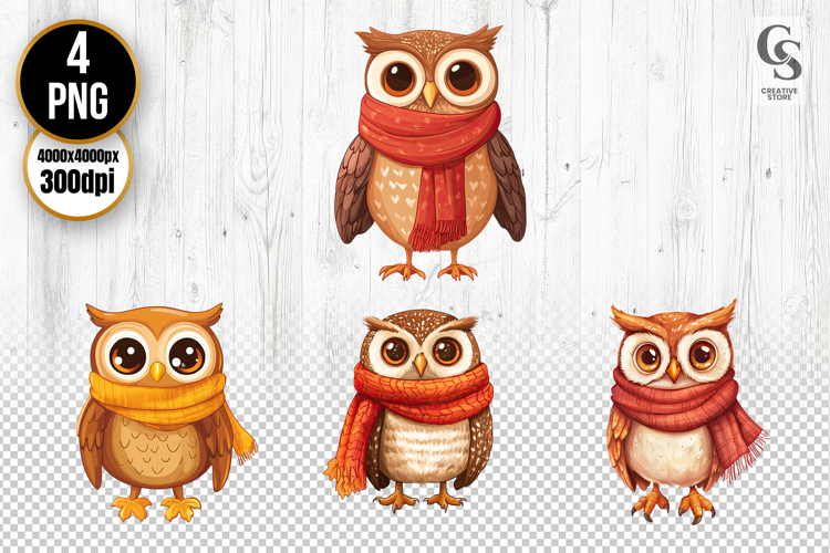 4 Autumn Owl with Scarf Clipart PNG Files Perfect for Greeting Cards, Invitations, Junk Journal, Party Decor, Scrapbooking and many other craft projects.
