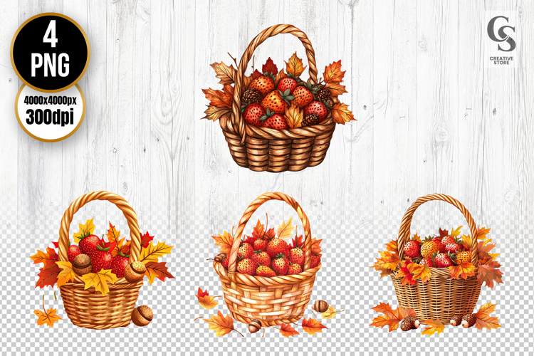 4 Autumn Strawberry Basket Clipart with Fall Leaves Files Perfect for Greeting Cards, Invitations, Junk Journal, Party Decor, Scrapbooking and many other craft projects.