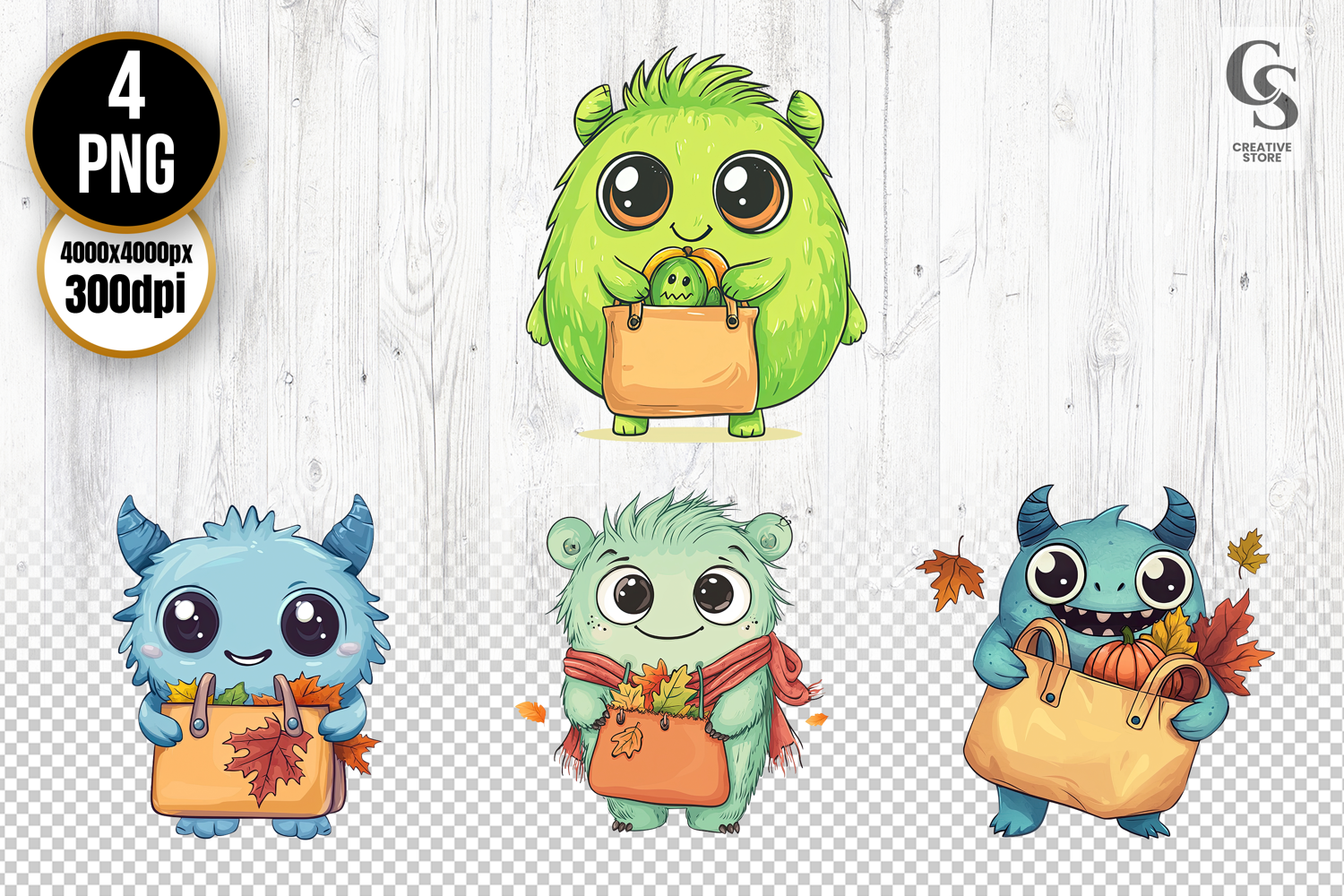 4 Cute Autumn Monster Clipart with Fall Bags Files Perfect for Greeting Cards, Invitations, Junk Journal, Party Decor, Scrapbooking and many other craft projects.