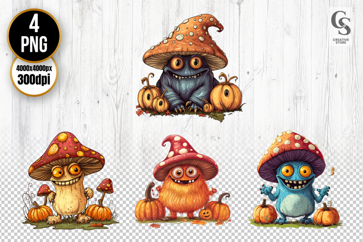 4 Mushroom Monster Pumpkin Clipart Sublimation PNG Files Perfect for Greeting Cards, Invitations, Junk Journal, Party Decor, Scrapbooking and many other craft projects.