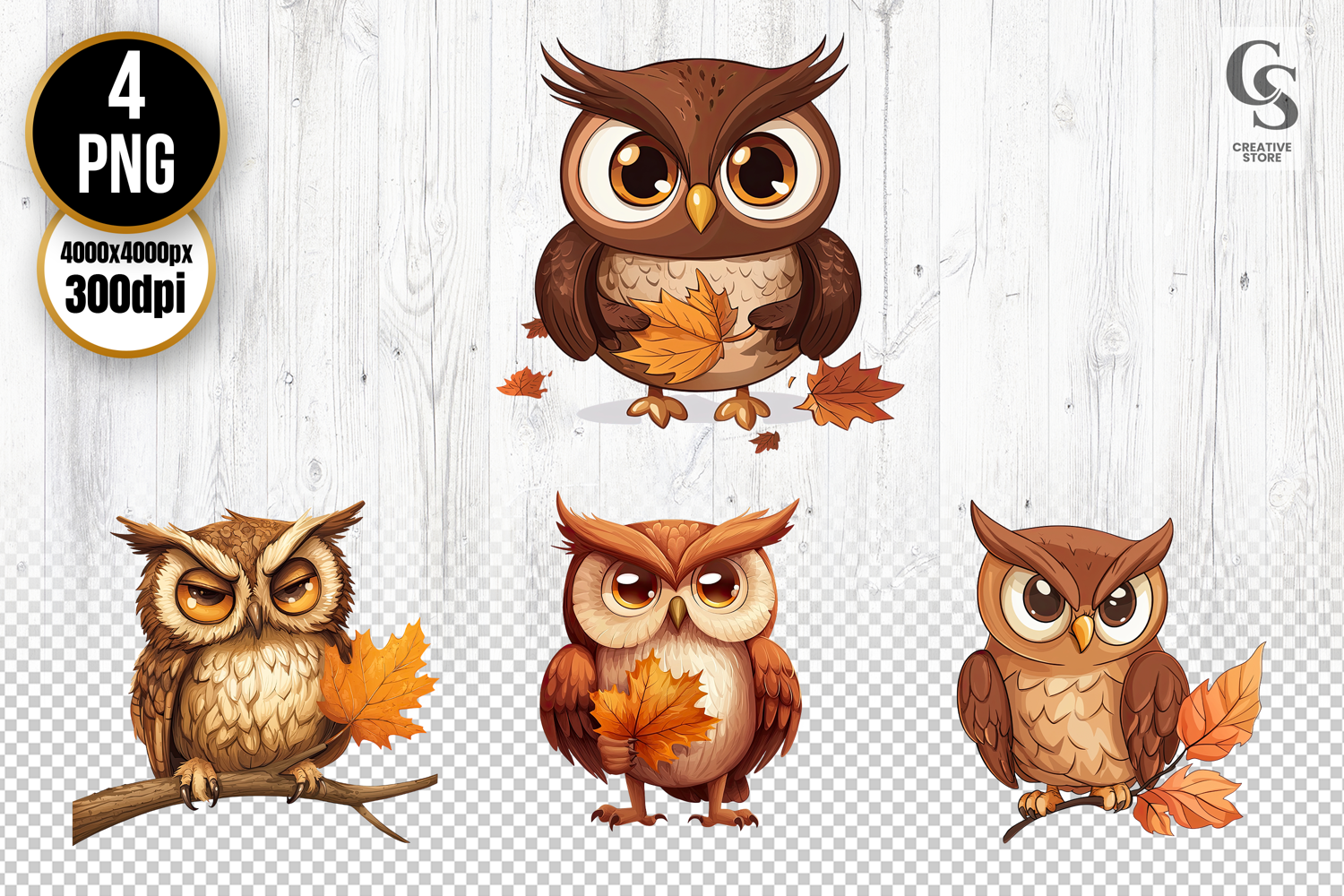 4 Cute Autumn Owl Clipart PNG | Fall Owls Illustration Files Perfect for Greeting Cards, Invitations, Junk Journal, Party Decor, Scrapbooking and many other craft projects.