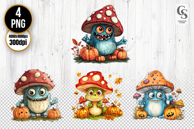 4 Cute Mushroom Monster Clipart PNG Files Perfect for Greeting Cards, Invitations, Junk Journal, Party Decor, Scrapbooking and many other craft projects.