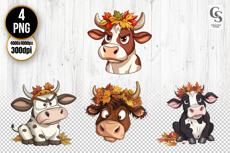 4 Cute Autumn Cow Clipart PNG | Fall Farm Animal Illustration Files Perfect for Greeting Cards, Invitations, Junk Journal, Party Decor, Scrapbooking and many other craft projects.