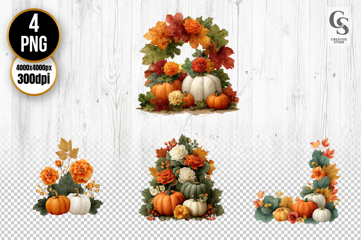 4 Fall Pumpkin Floral Arrangement Clipart PNG Files Perfect for Greeting Cards, Invitations, Junk Journal, Party Decor, Scrapbooking and many other craft projects.