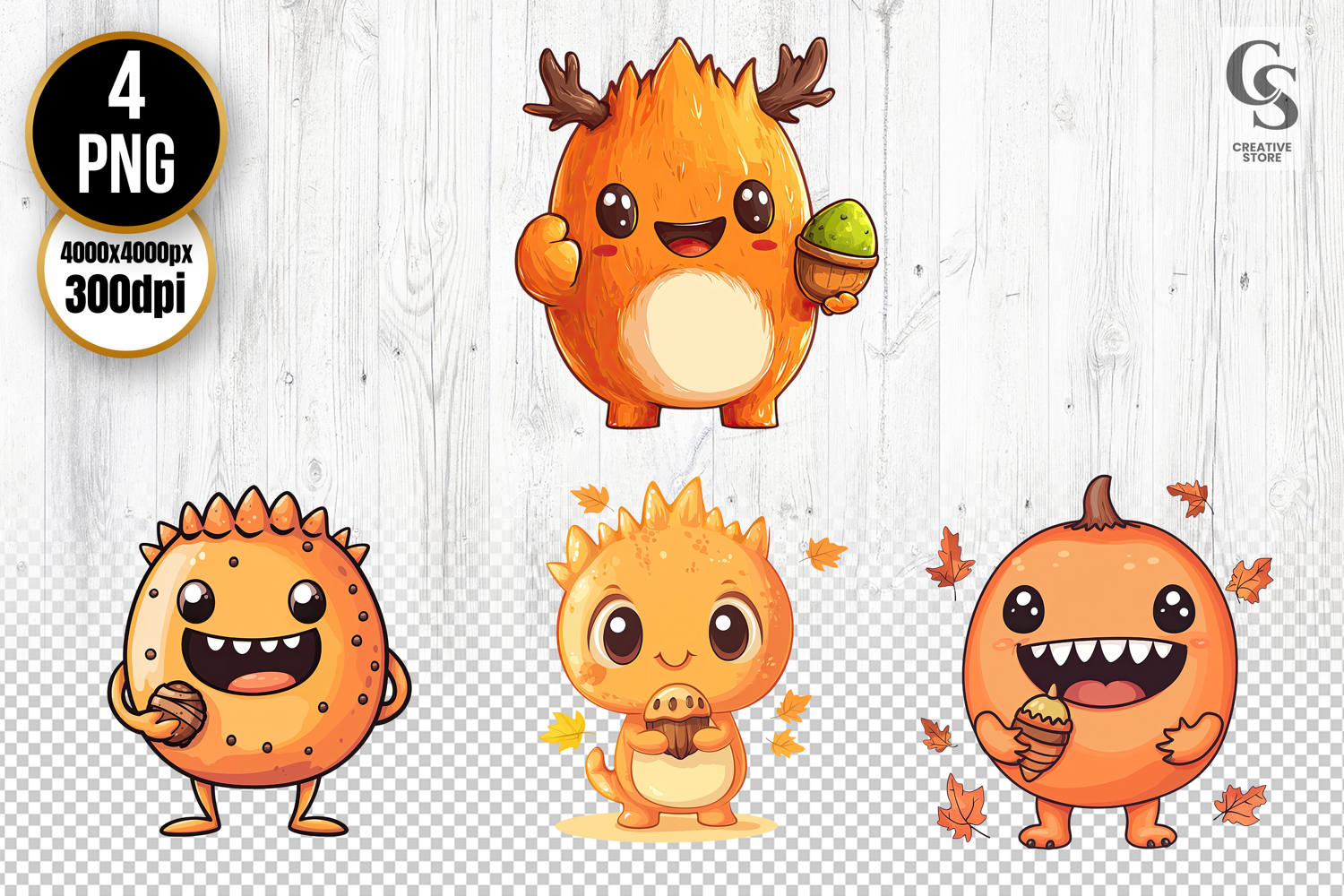 4 Cute Autumn Monster Clipart PNG Files Perfect for Greeting Cards, Invitations, Junk Journal, Party Decor, Scrapbooking and many other craft projects.